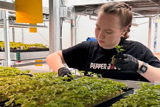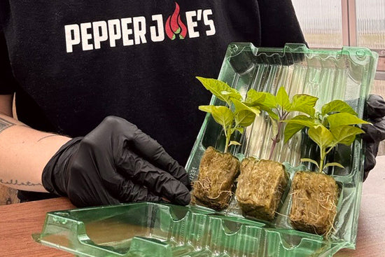 At the Pepper Joe’s Greenhouse, our growers start thousands of pepper seeds each season to produce healthy live plants. We carefully select unique varieties, specializing in rare and super-hot peppers. Each plant is nurtured with care to develop strong stems and healthy root systems. They stand 2–6 inches tall and already have their true leaves—allowing you to get a jumpstart in your garden!
