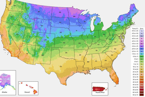 The USDA Grow Zone Map is the go-to standard for gardeners and growers. This map determines which perennial plants are most likely to thrive at a specific location. It's important that your perennial plants are hardy enough to survive the winter in your area. Winter damage occurs the most when plants are planted out of their range. If you take a look at the map, you will see a scale. The 1-13 categorizes every location in the United States by its coldest average temperature of the year.