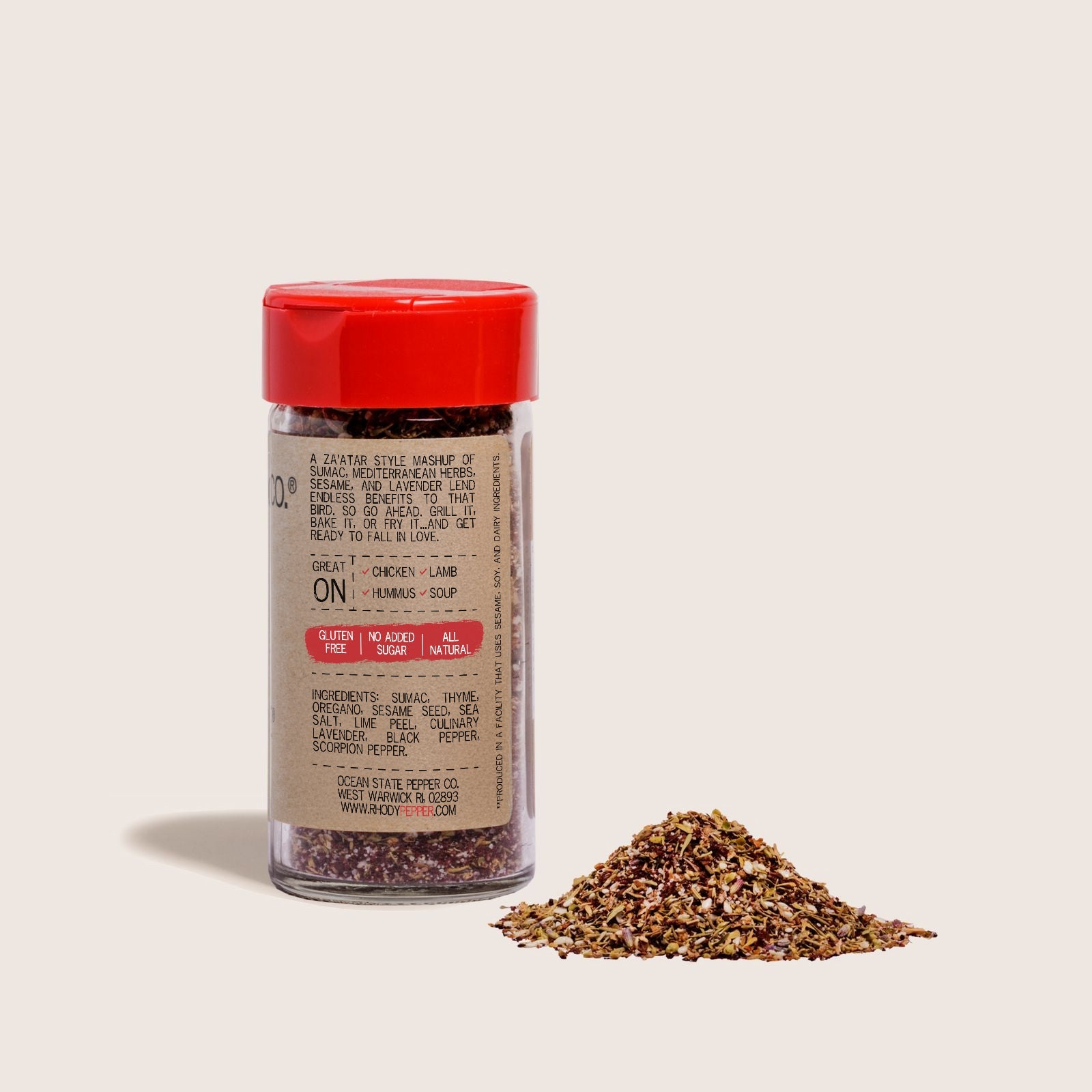Sumac, thyme, oregano, sesame seed, sea salt, lime peel, culinary lavender, black pepper, scorpion pepper