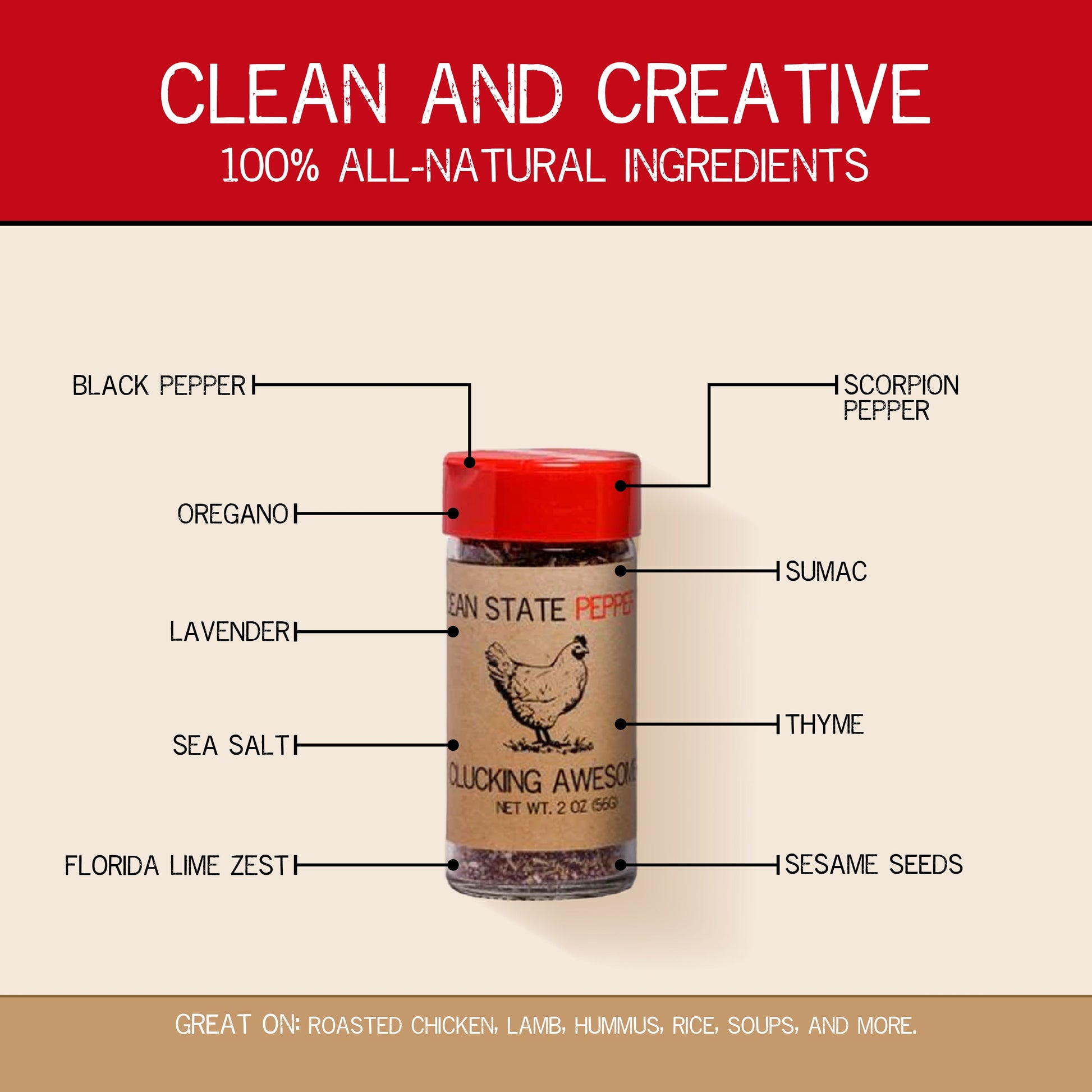 Clucking Awesome is a unique all-purpose poultry seasoning for chefs and home cooks alike. Crafted with sumac, a blend of herbs, floral lavender, a touch of scorpion pepper and lime zest, it adds bold flavor to poultry dishes without overpowering them. It's the perfect balance of zesty spice and subtle citrus notes, all wrapped up in a Mediterranean flavor profile. This blend rocks, it's super unique and one of our all-time favorites.