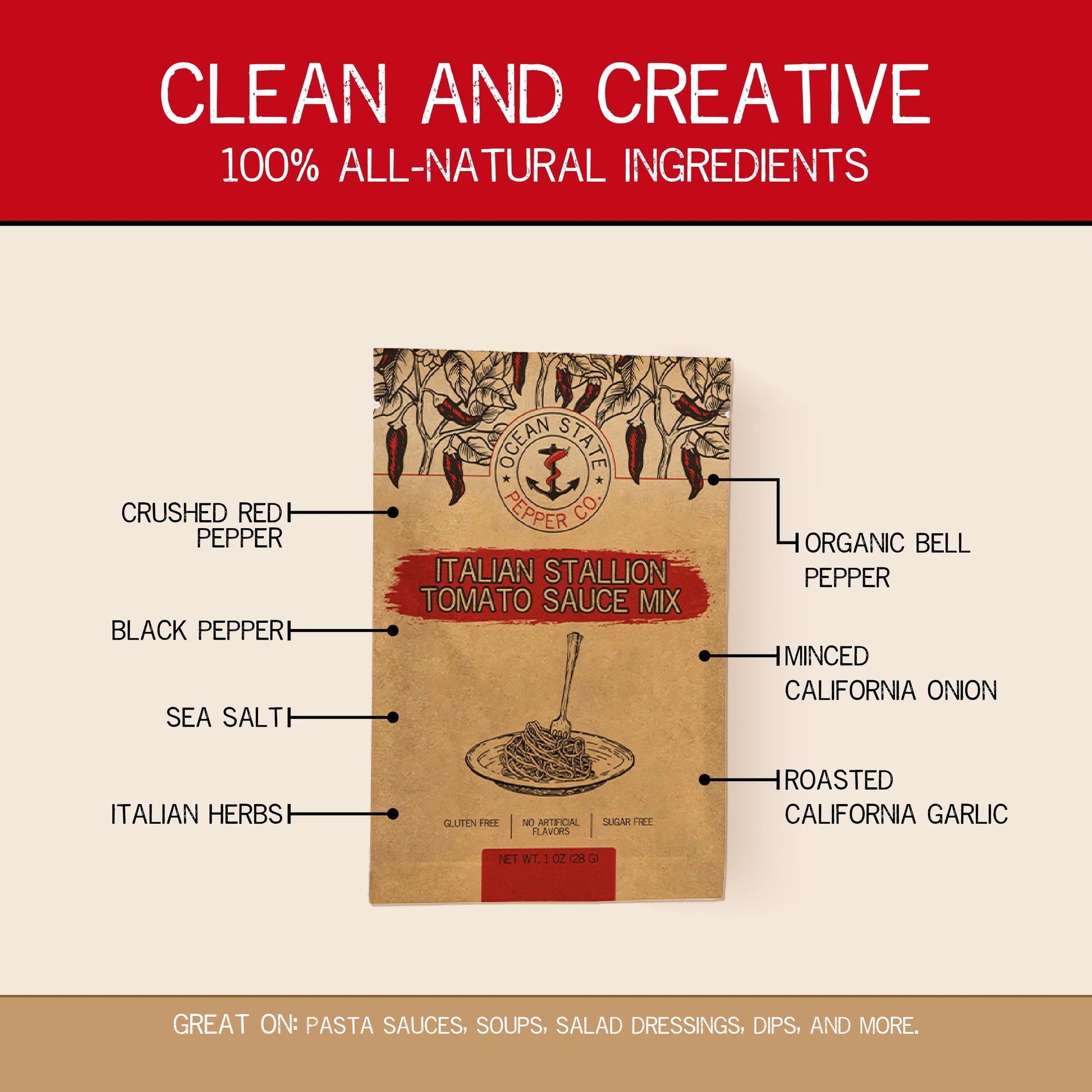 Organic bell peppers, minced onion, roasted garlic, crushed chilies, black pepper, sea salt, basil, oregano, parsley.