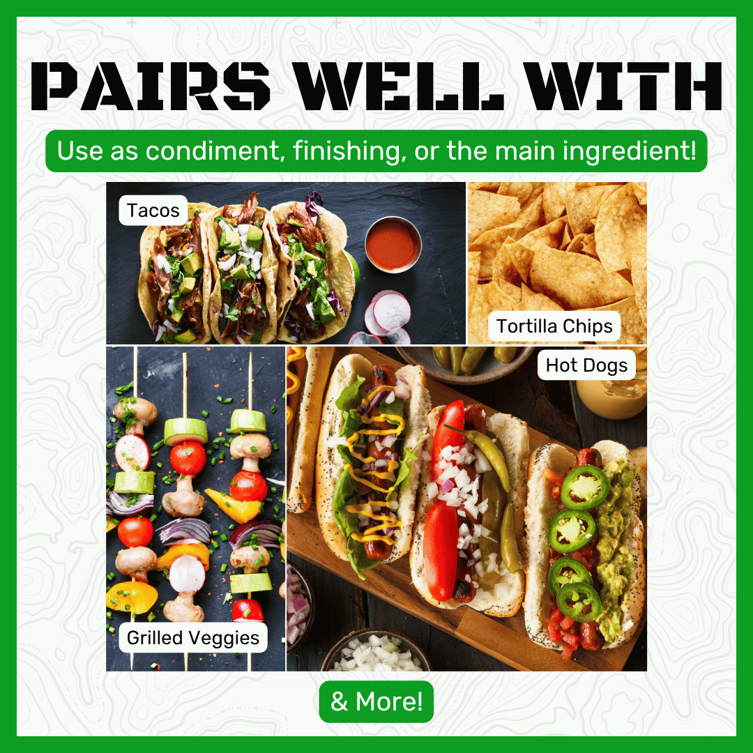 This is our take on the classic salsa verde. This isn't your normal verde sauce, this is taco-crunching, cheese-dripping, extra guac goodness verde.