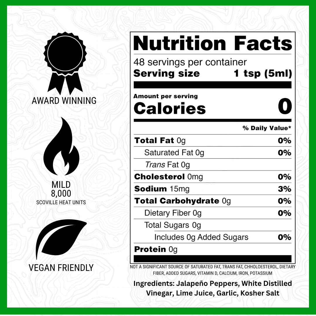 Jalapeño Peppers, White Distilled Vinegar, Lime Juice, Spices, Salt
