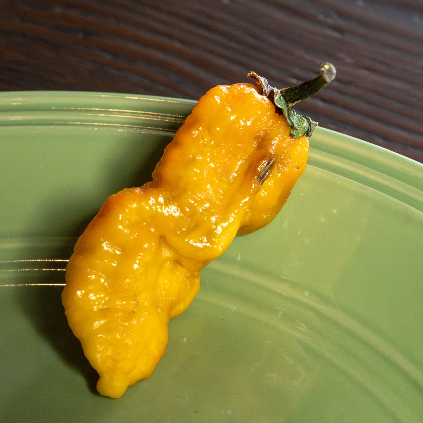 These plants can grow over 4 ft. tall and produce wild-shaped elongated peppers that have color bleed up the calyx and stem. The bright yellow pods have a fruity citrus flavor similar to other yellow super hots. This pepper will not disappoint if you enjoy growing the hottest peppers in the world!