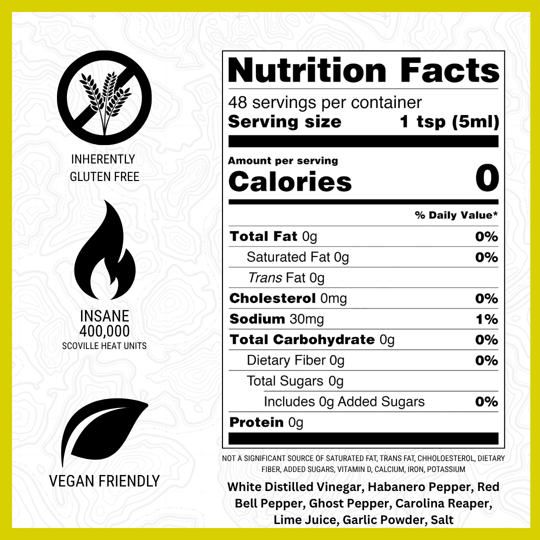 White Distilled Vinegar, Habanero Pepper, Red Bell Pepper, Ghost Pepper, Carolina Reaper, Lime Juice, Spices, Salt