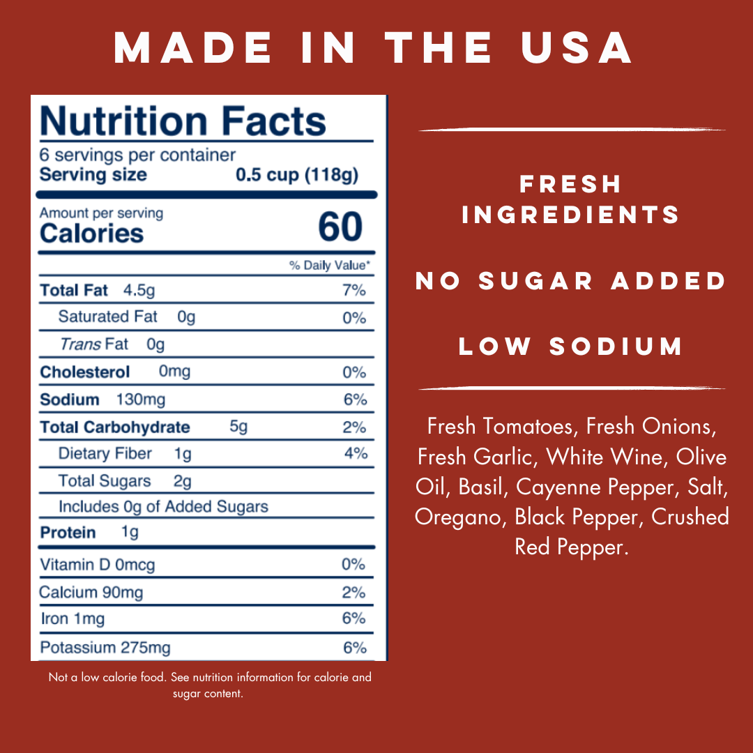 Fresh Tomatoes, Fresh Onions, Fresh Garlic, White Wine, Olive Oil, Basil, Cayenne Pepper, Salt, Oregano, Black Pepper, Crushed Red Pepper
