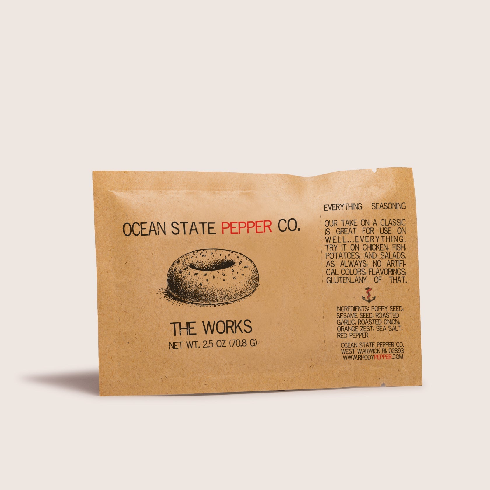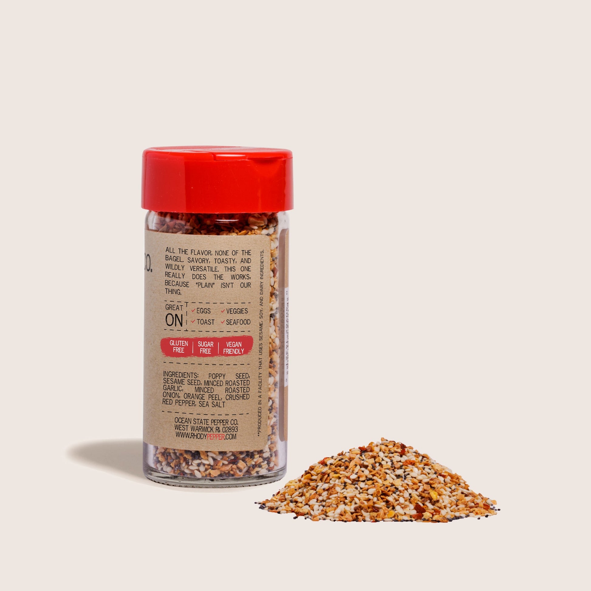 Poppy seed, sesame seed, minced roasted garlic, minced roasted onion, orange peel, crushed red pepper, sea salt