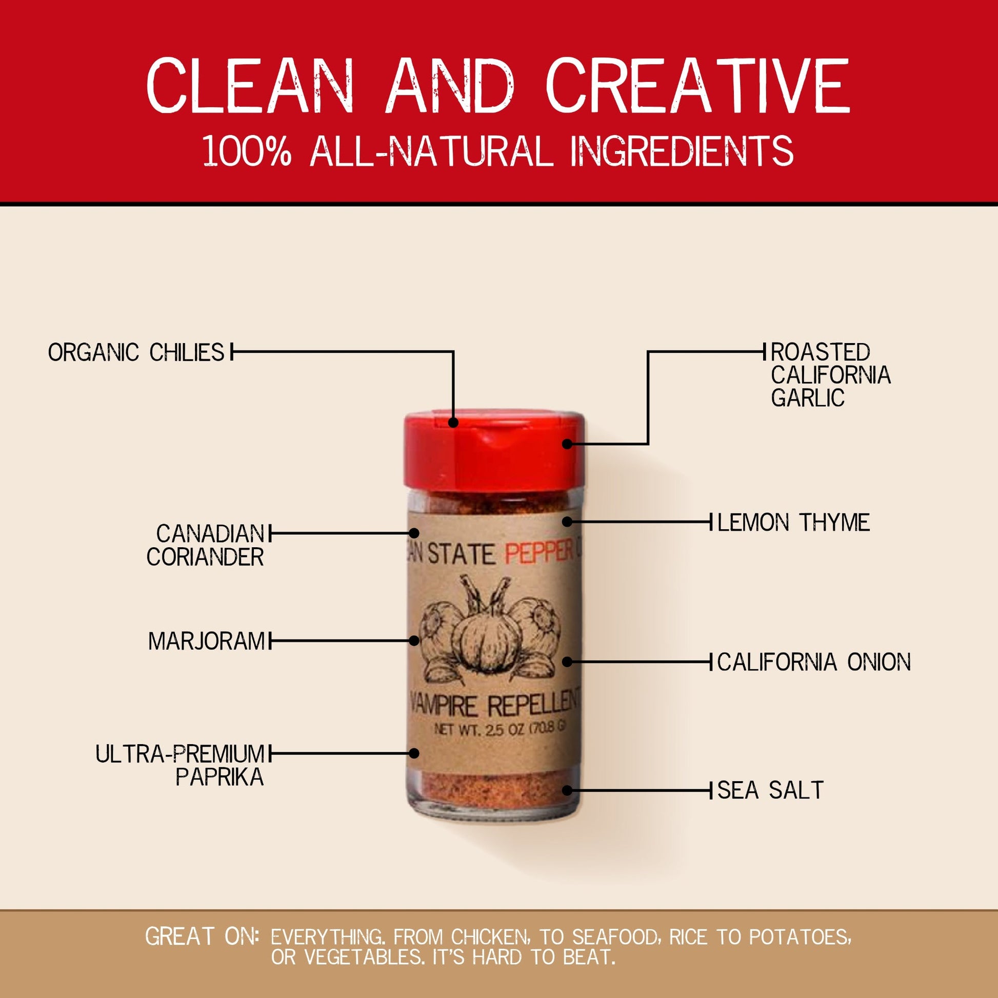 Roasted minced garlic, granulated garlic, granulated onion, sea salt, Canadian coriander, ASTA 120 paprika, marjoram, lemon thyme, organic chilies