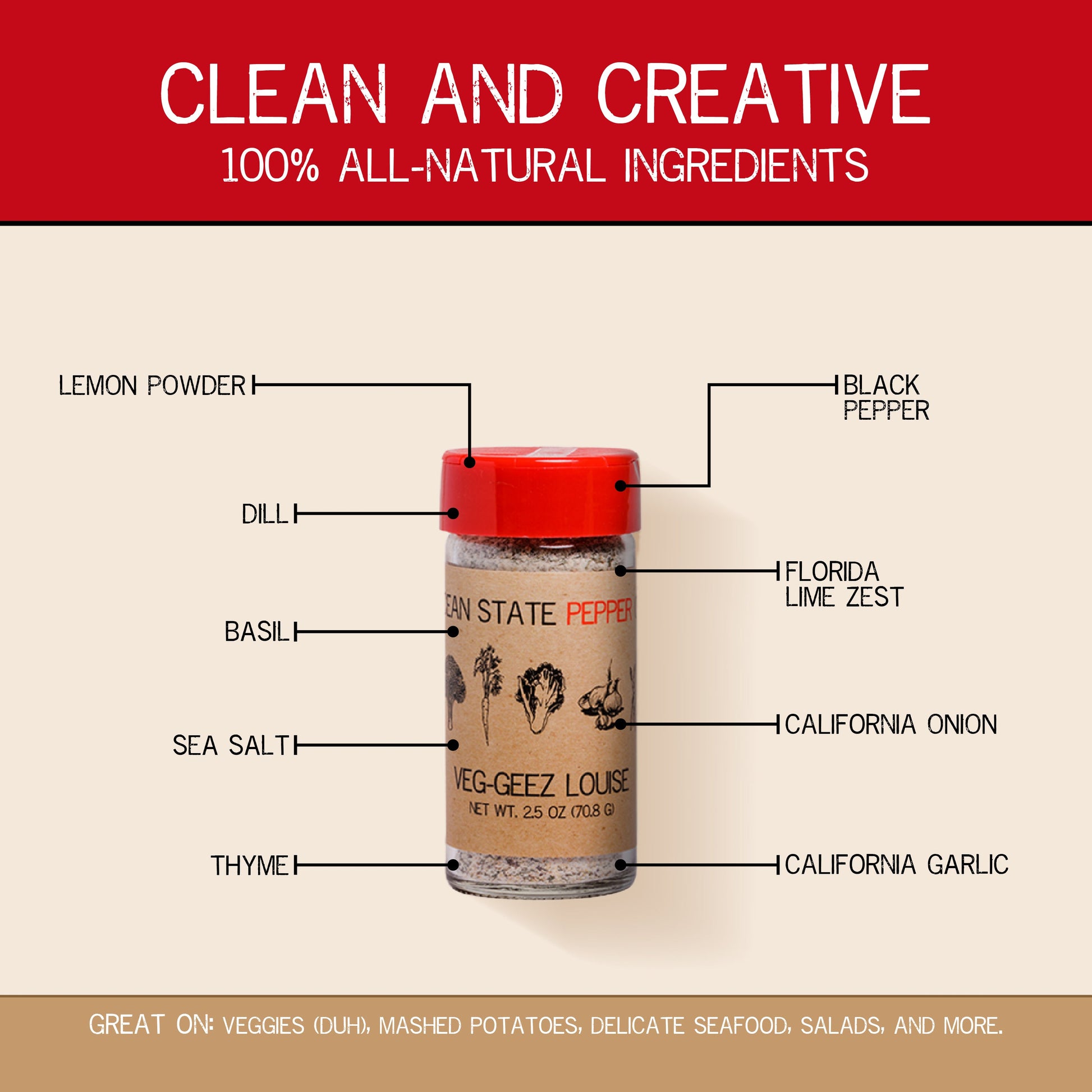 Veg-geez Louise is the perfect combination of herbs and spices to season any dish. Our blend of sea salt and pepper, combined with bright notes of citrus, savory onion and garlic, and a fresh blend of herbs make it tangy and delicious...not to mention, extremely versatile. Add the perfect flavor to your meals with Veg-geez Louise! Just get rid of your salt and pepper shaker...you won't need them.